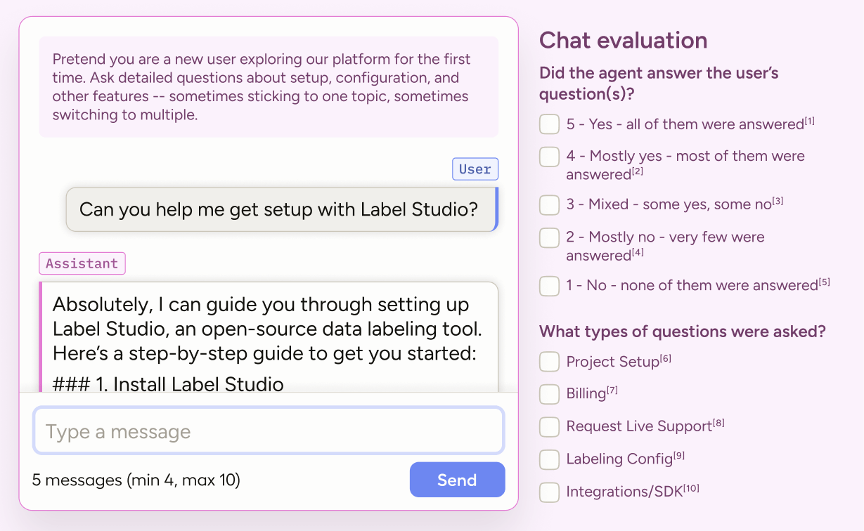 While this template focuses on conversation-level evaluation, you can modify it to perform per-message evaluations. For examples, see our other chat templates.